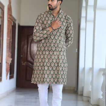 Men’s Green Printed Cotton Kurta Pyjama Set | Traditional Festive & Wedding Wear