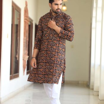 Men’s Brown & Black Printed Cotton Kurta Pyjama Set | Traditional Festive & Wedding Wear