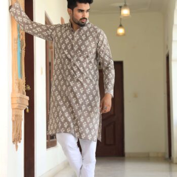 Men’s Grey Printed Cotton Kurta Pyjama Set | Traditional Festive & Wedding Wear