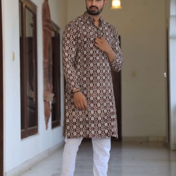 Men’s Brown Floral Printed Cotton Kurta Pyjama Set | Traditional Festive & Wedding Wear