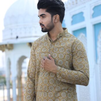 Men’s Mustard Yellow Handblock Printed Cotton Kurta Pyjama Set | Traditional Festive & Wedding Wear