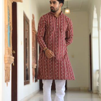Men’s Maroon Printed Cotton Kurta Pyjama Set | Traditional Festive & Wedding Wear