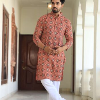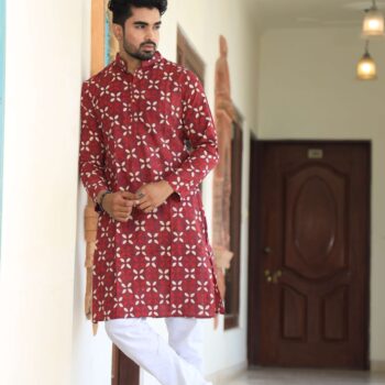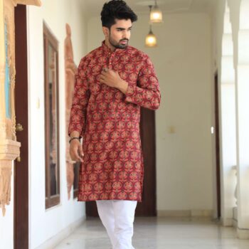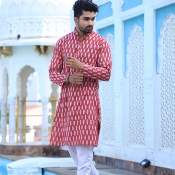 Men’s Red Printed Cotton Kurta Pyjama Set | Traditional Festive & Wedding Wear