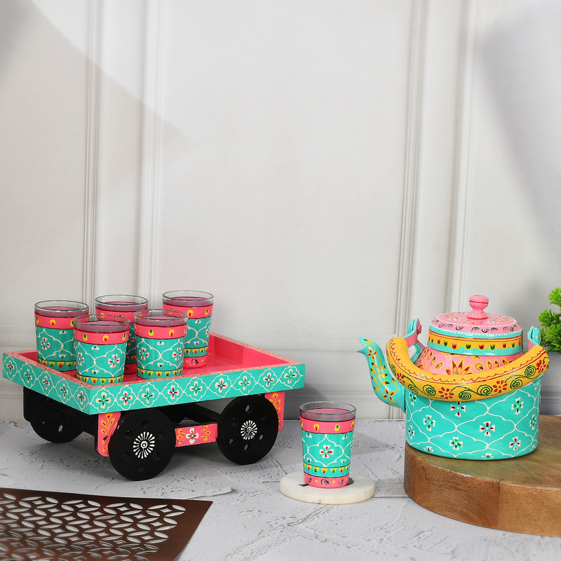 Aqua Blue & Pink Dual-Tone Hand-Painted Aluminium Tea Kettle Set with 6 Glass Cups and Wooden Serving Cart | Artistic Table Décor