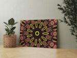 Elegant golden round frame with vibrant artwork, perfect for any living room.