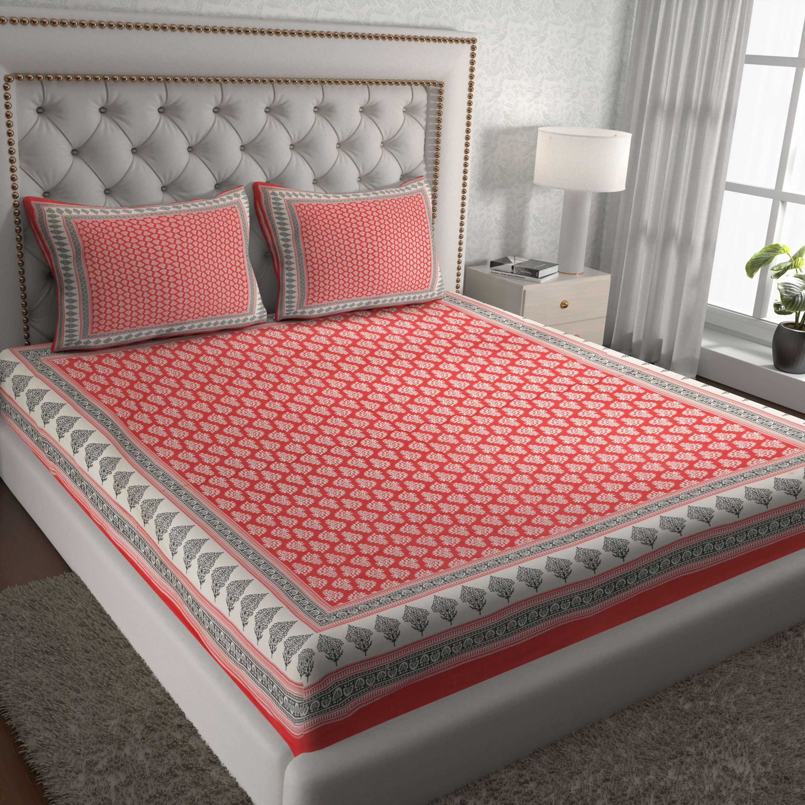 Enhance your bedroom d?cor with this Jaipuri Cotton Printed Double Bedsheet. Crafted from 100% pure cotton, it offers softness, breathability, and elegant traditional prints for a comfortable and stylish look. Comes with two matching pillow covers.
