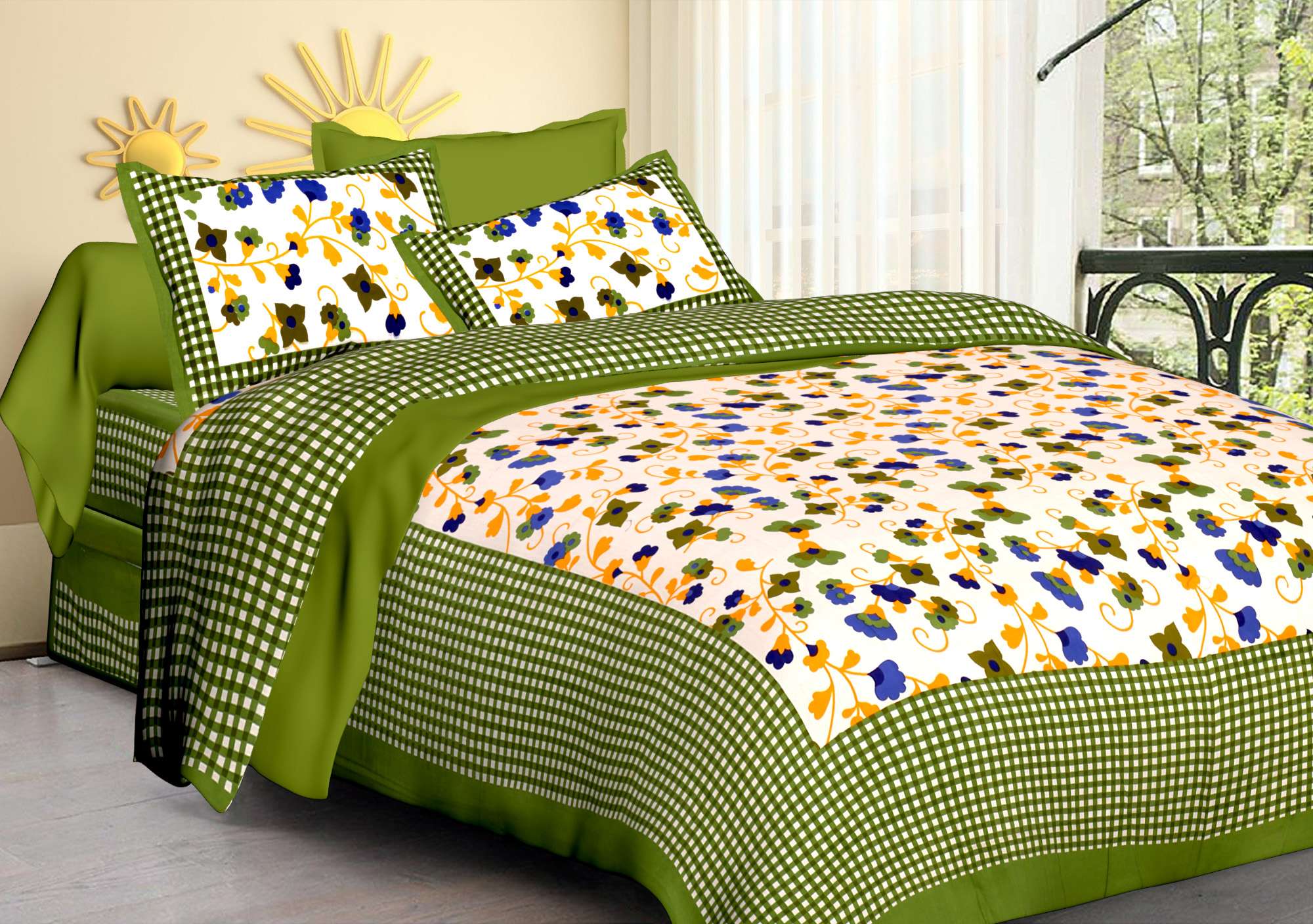 Enhance your bedroom d?cor with this Jaipuri Cotton Printed Double Bedsheet. Crafted from 100% pure cotton, it offers softness, breathability, and elegant traditional prints for a comfortable and stylish look. Comes with two matching pillow covers.