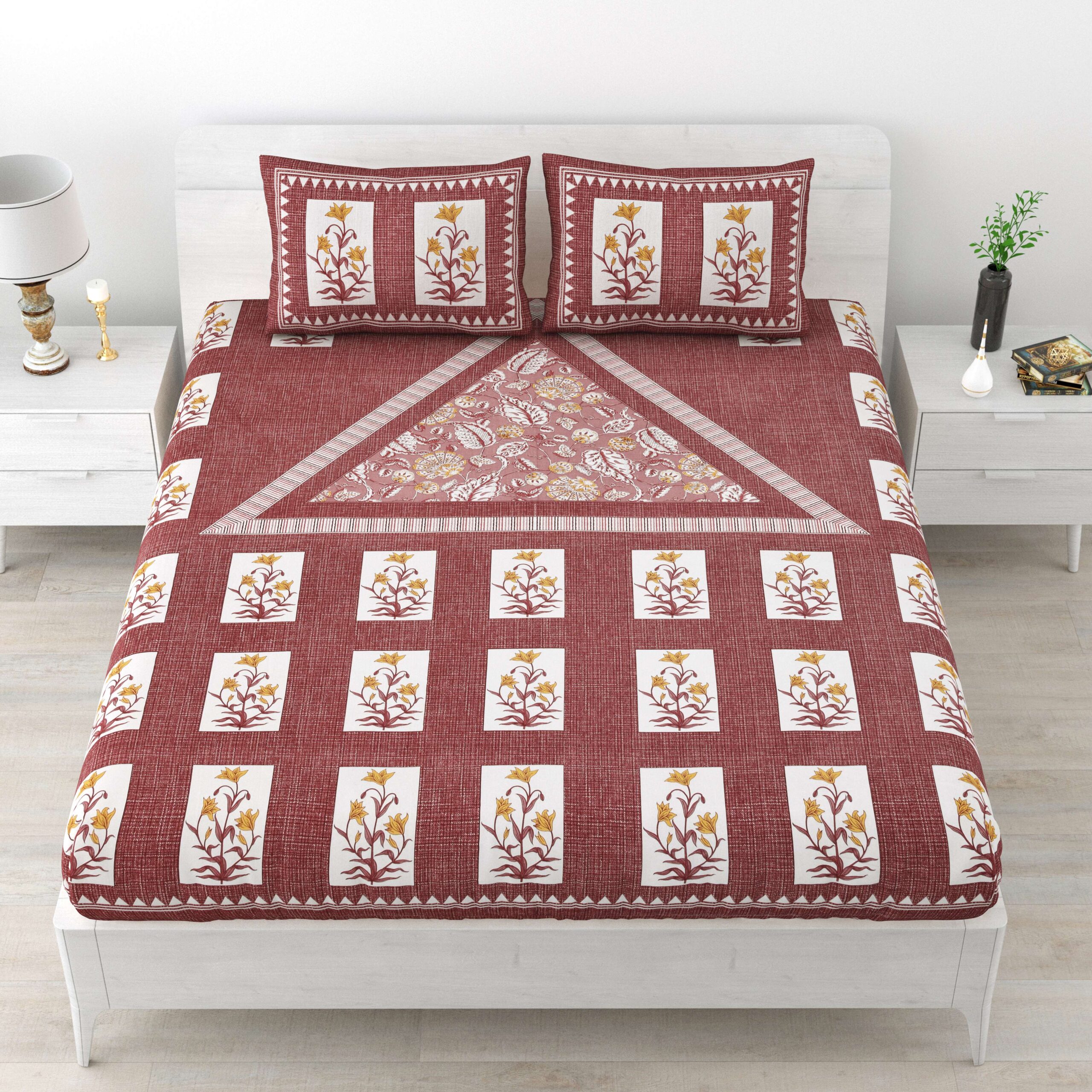 royal touch to your bedroom with this Rajasthani Jaipuri Sanganeri Bedsheet. Crafted from soft cotton, it features vibrant hand block prints inspired by Jaipur?s rich heritage. Comfortable, durable, and beautifully designed ? this bedsheet comes with 2 matching pillow covers to complete the elegant look.