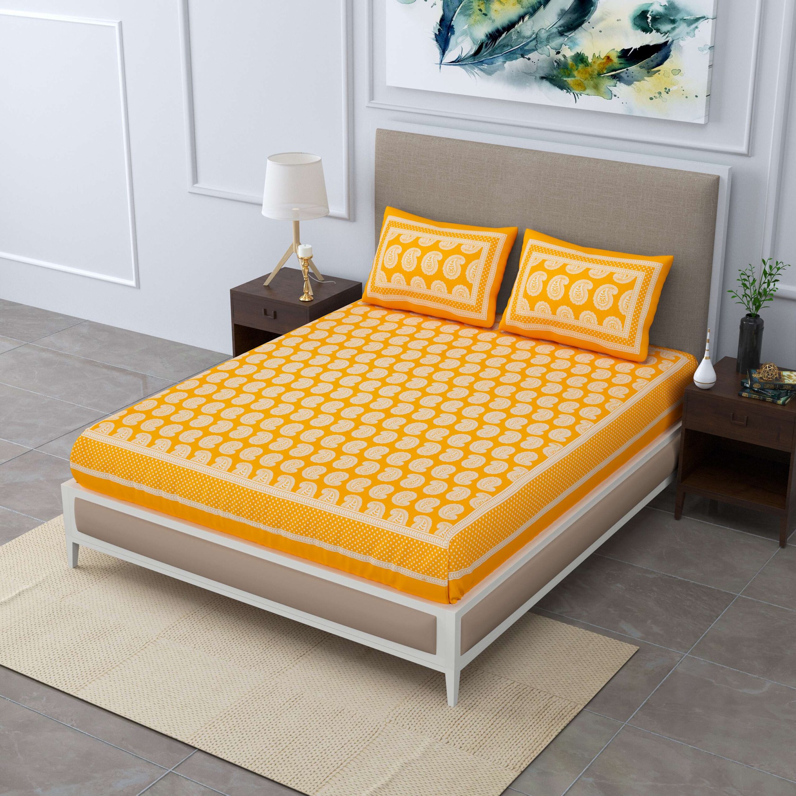 Jaipuri Stylish Block Printed Double Bed Bedsheet With Two Pillow Cover (Yellow)