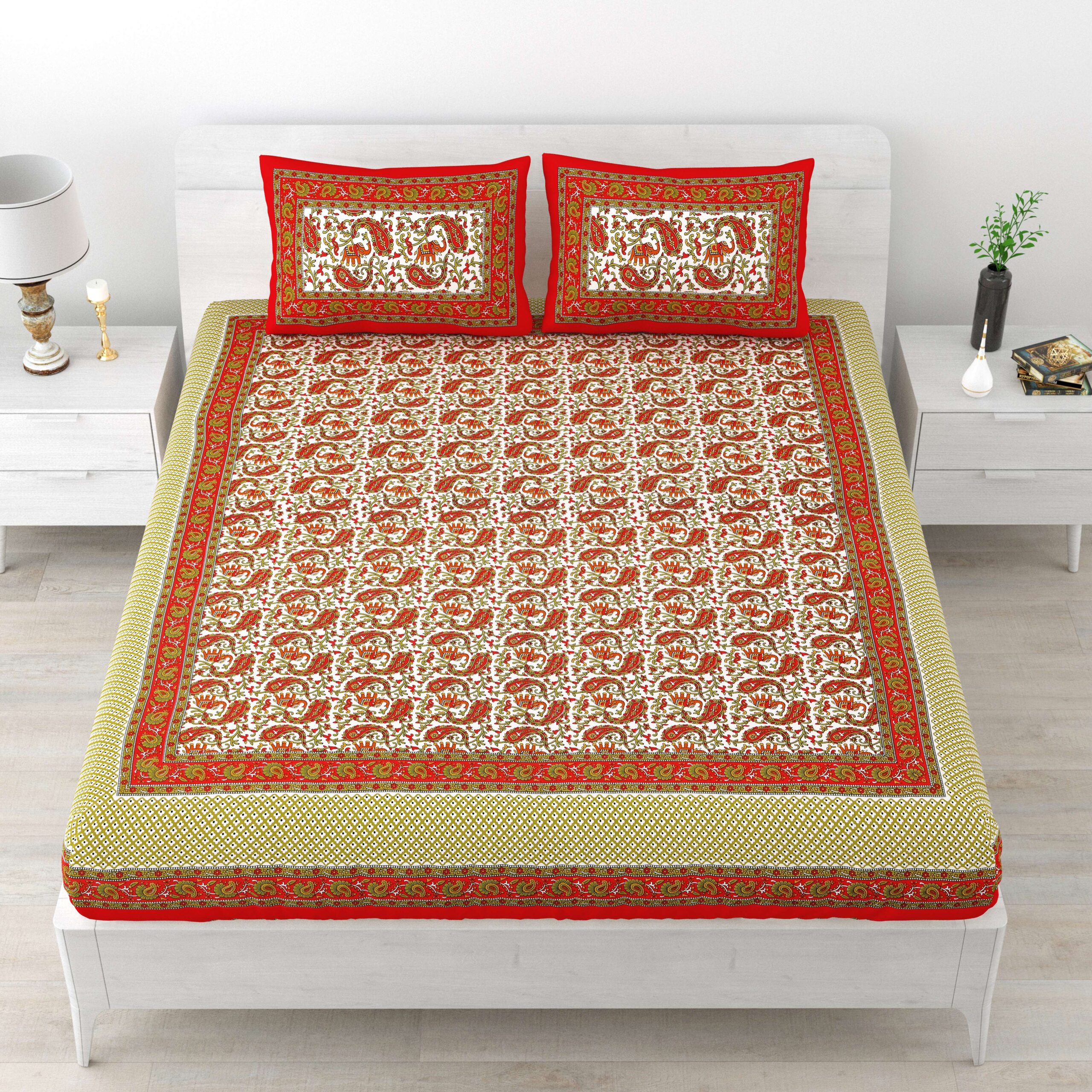 Experience the charm of Rajasthan with this Rajasthani Jaipuri Cotton Double Bedsheet featuring vibrant prints and two matching pillow covers ? a perfect blend of comfort, tradition, and elegance.