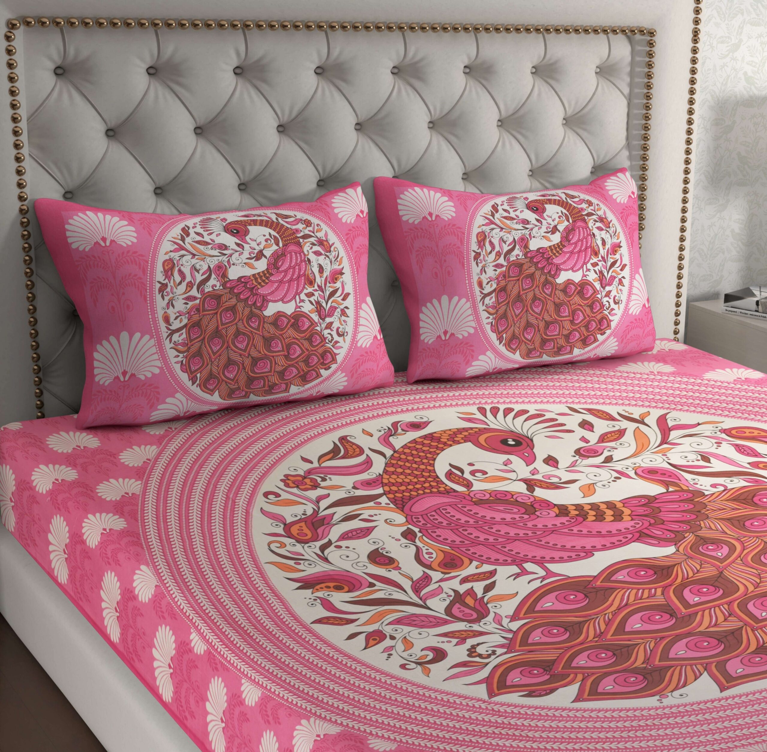 Home Bedsheets Jaipuri Stylish Peacock Printed Double Bed Bedsheet With Two Pillow Cover (Pink)