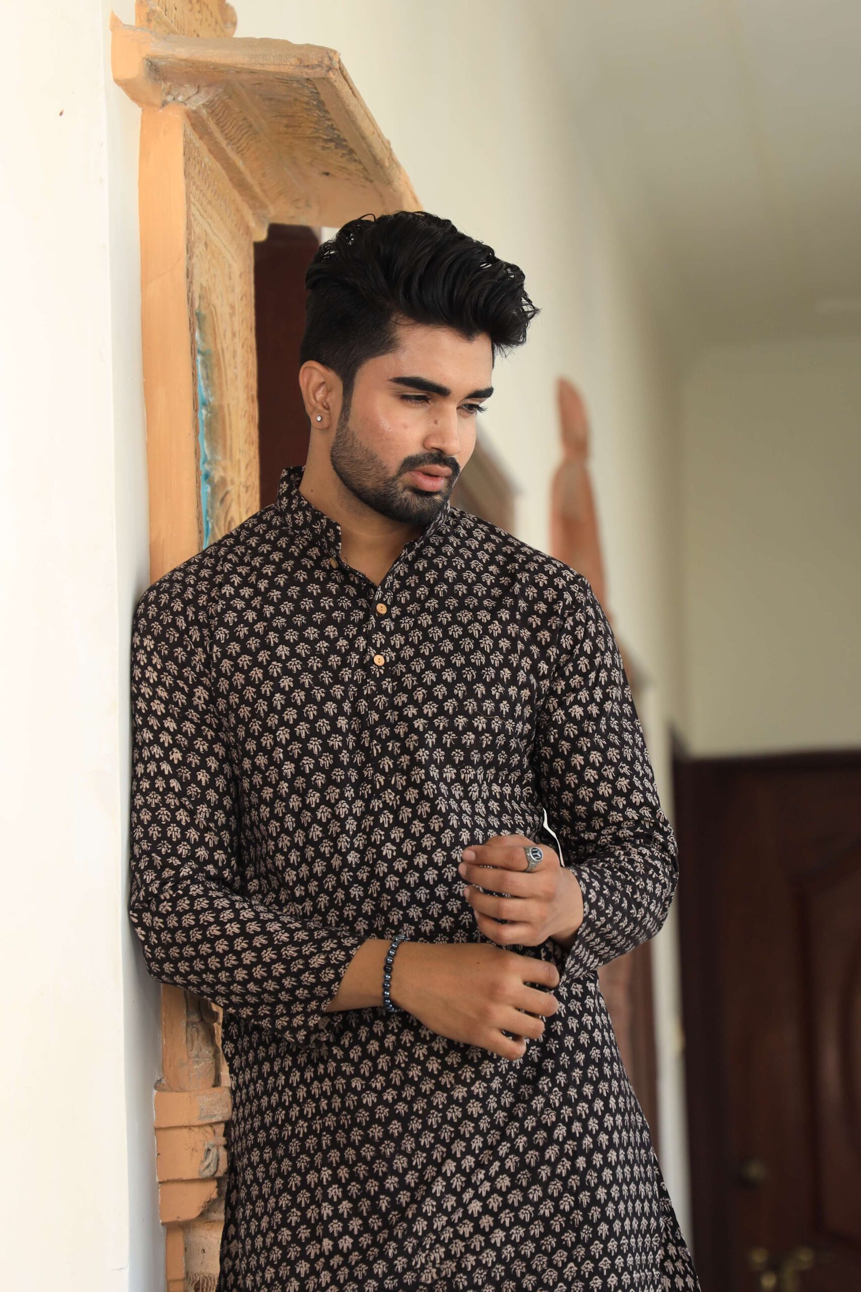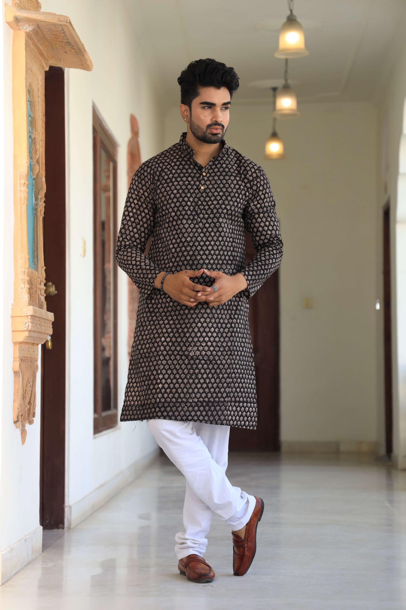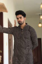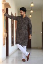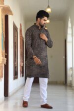 Upgrade your ethnic wardrobe with this men’s black printed cotton kurta pyjama set. Made from premium-quality cotton, it offers a relaxed fit and all-day comfort while keeping your look refined and festive-ready.