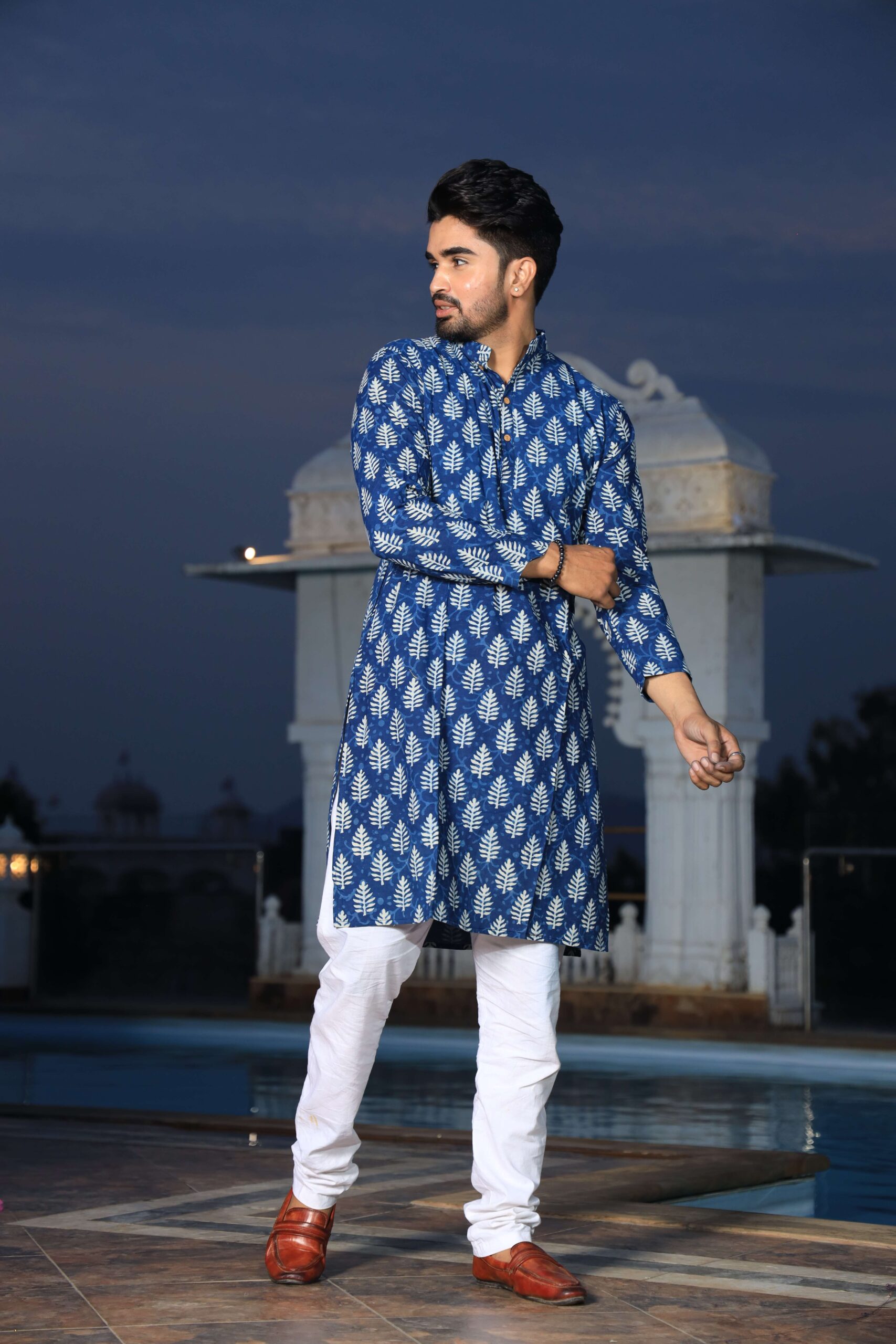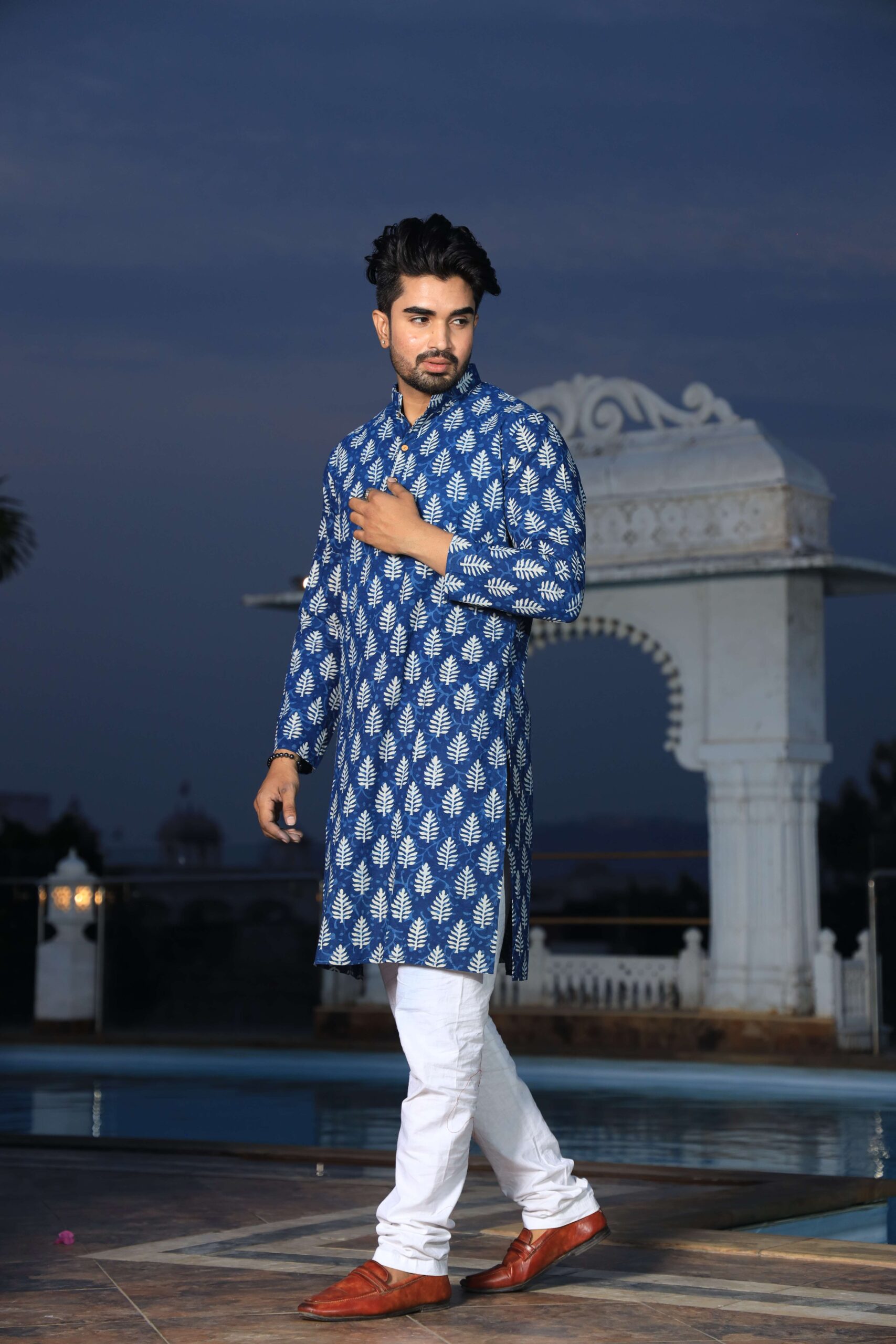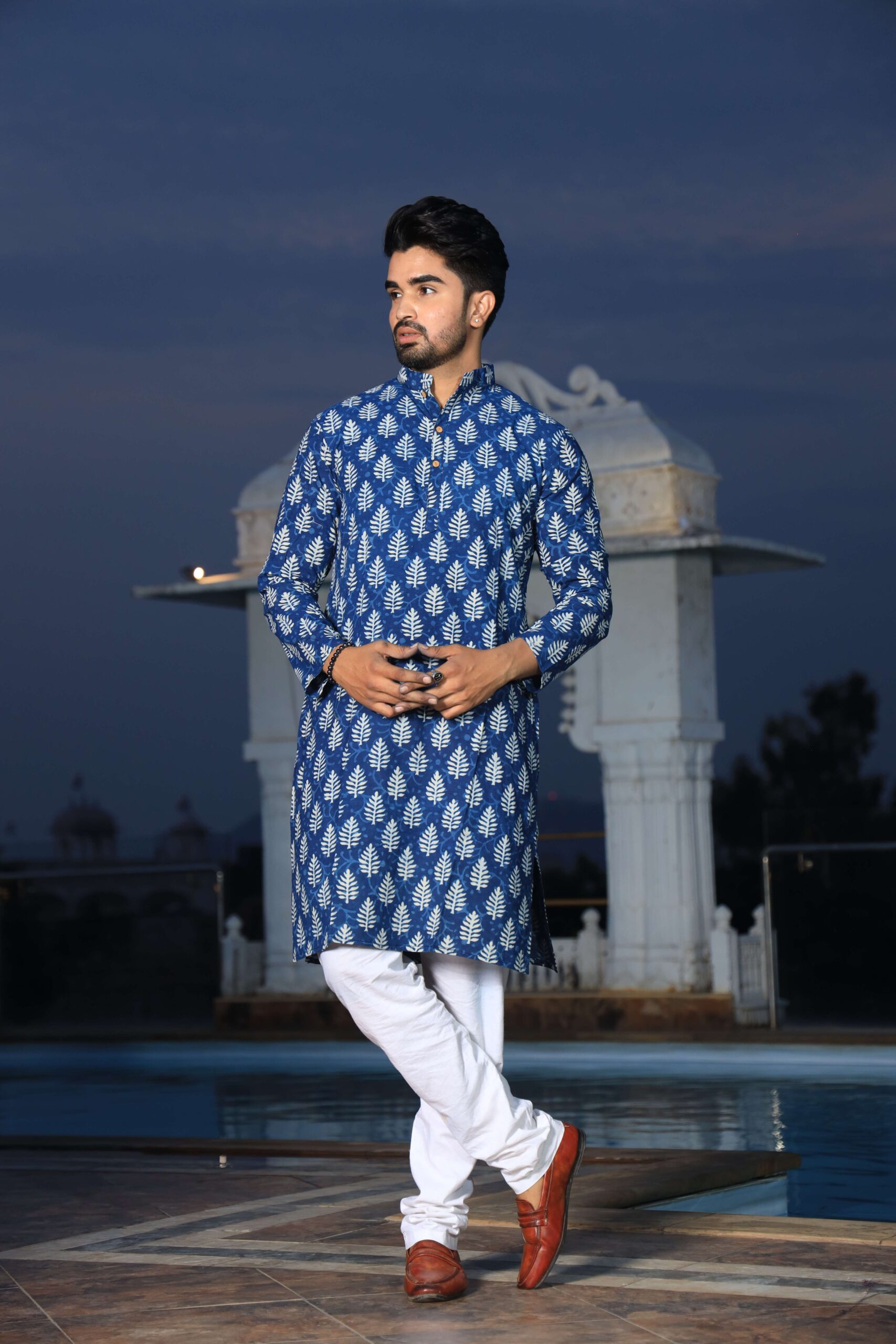 Upgrade your ethnic wardrobe with this men’s blue printed cotton kurta pyjama set. Made from premium-quality cotton, it offers a relaxed fit and all-day comfort while keeping your look refined and festive-ready.
