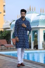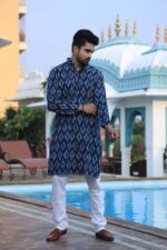 Men’s blue printed cotton kurta pyjama set crafted in soft, breathable cotton for day-long comfort. Perfect for festive occasions, weddings, pujas and family gatherings, this stylish kurta with classic white pyjama keeps you looking sharp and feeling relaxed.