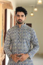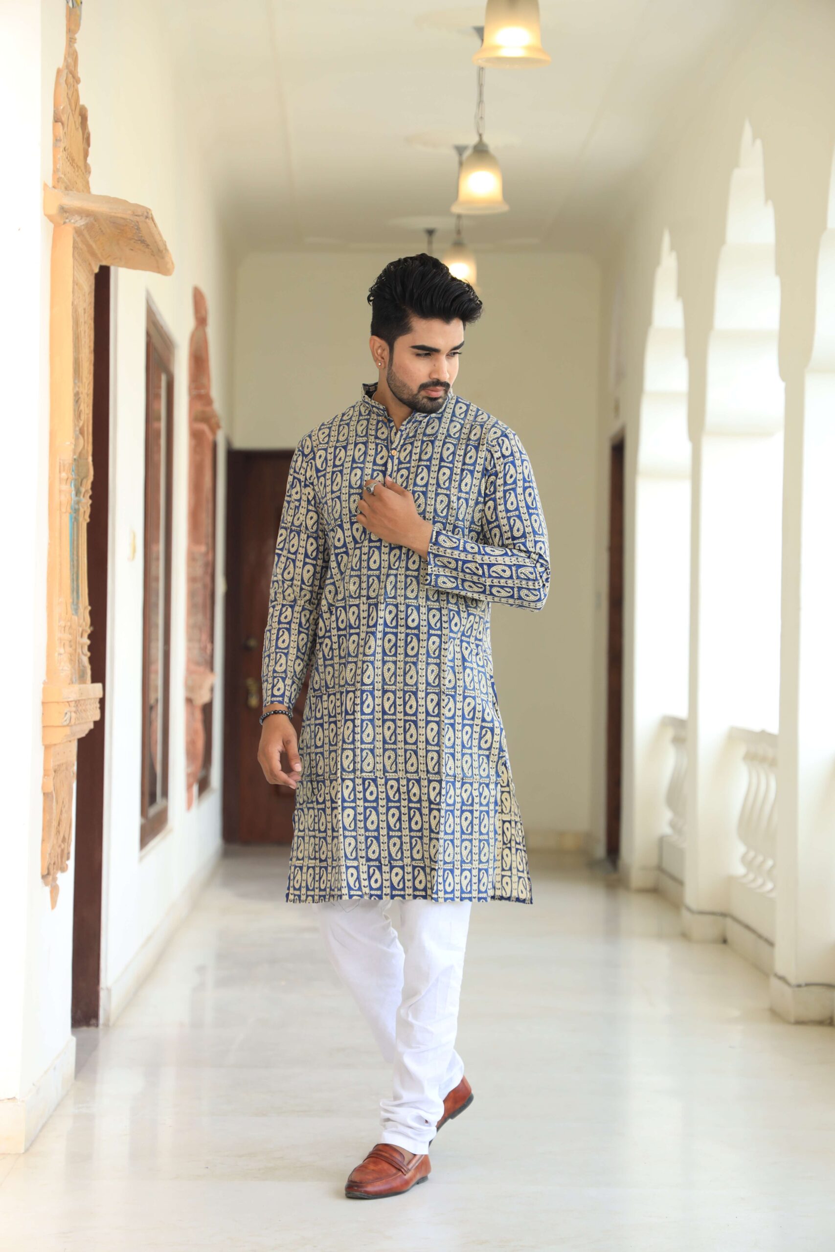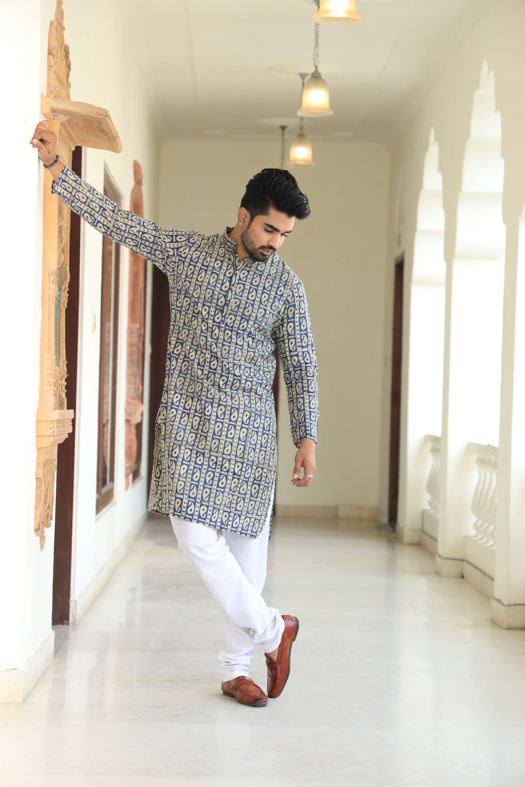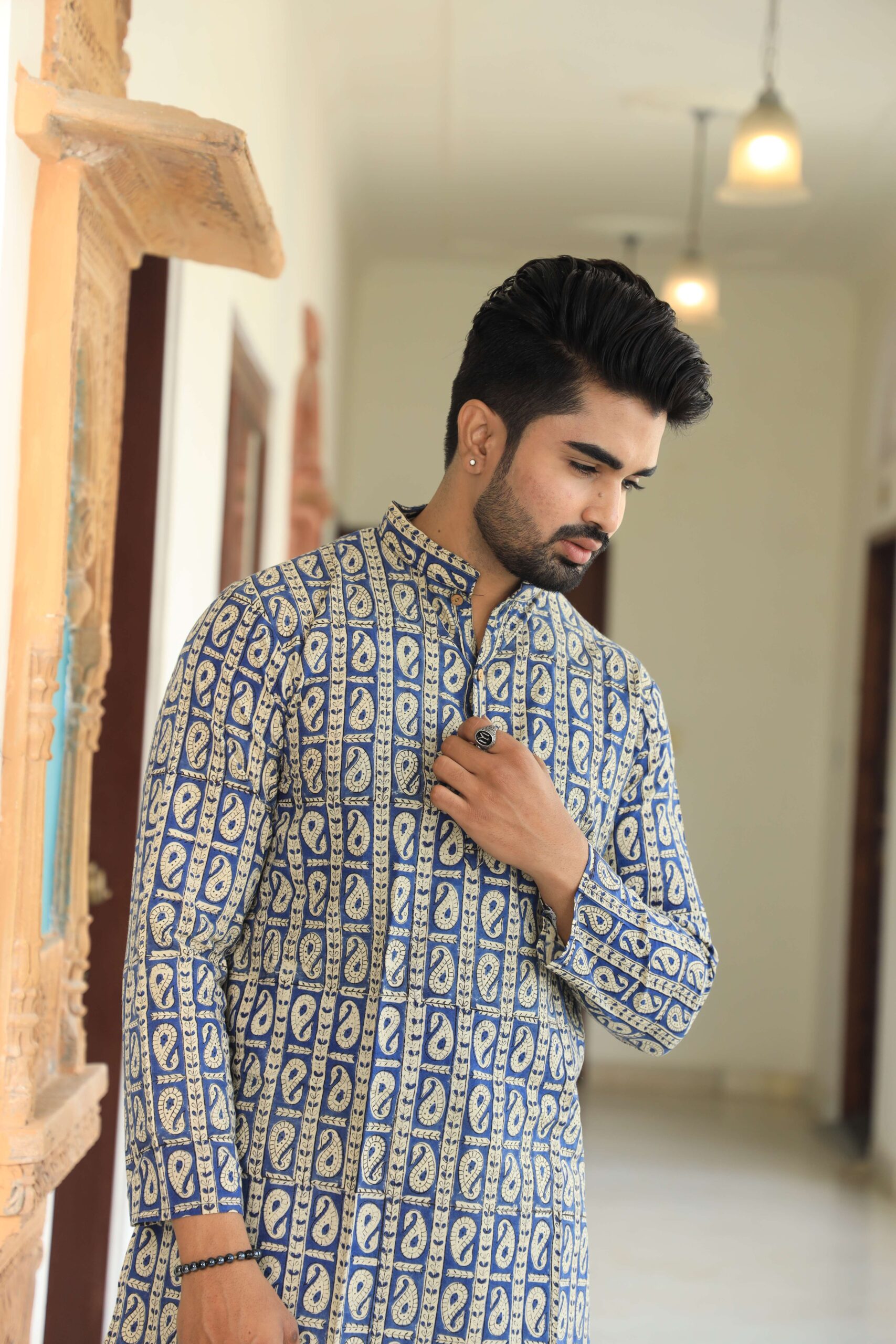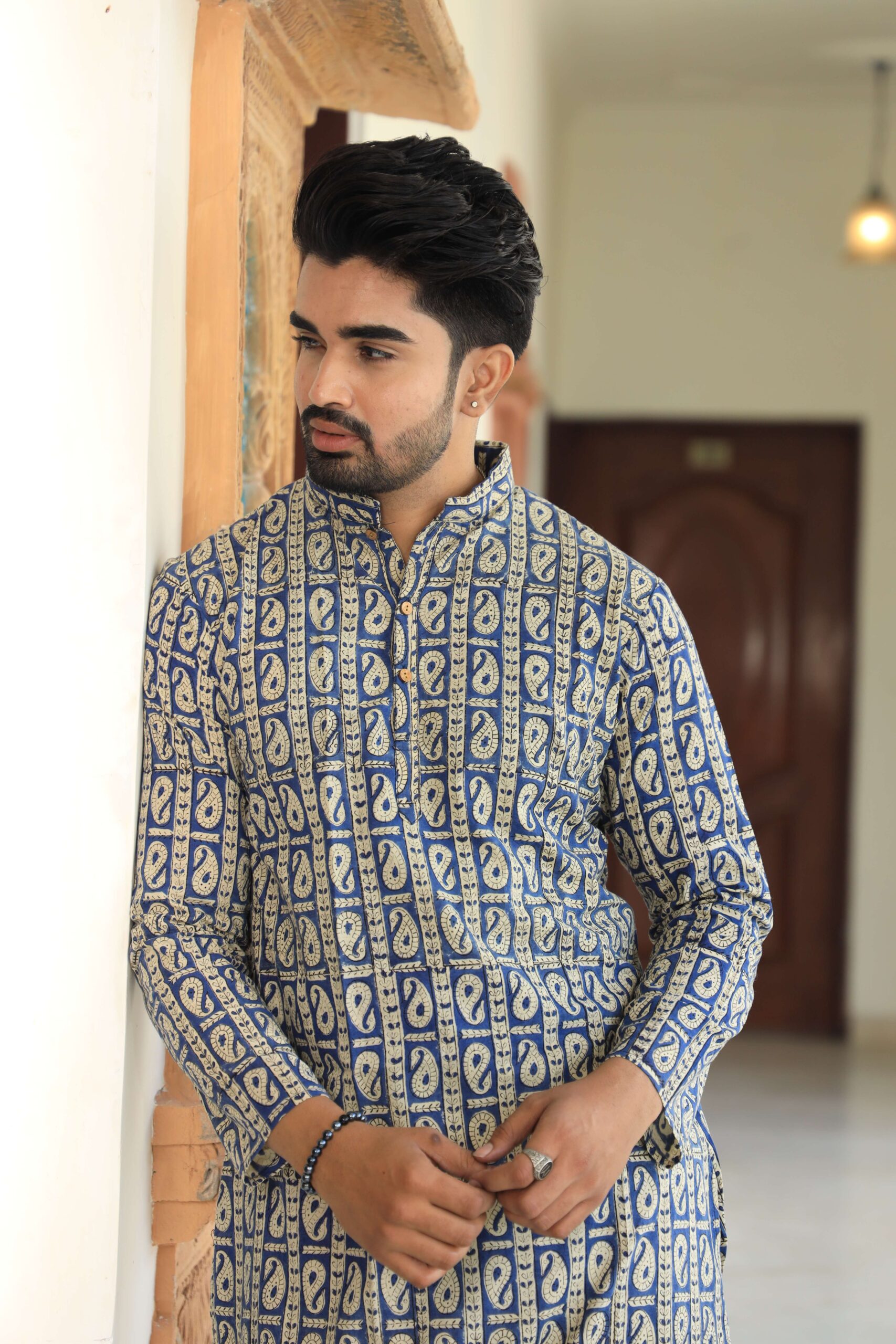 Upgrade your ethnic wardrobe with this men’s blue printed cotton kurta pyjama set. Made from premium-quality cotton, it offers a relaxed fit and all-day comfort while keeping your look refined and festive-ready.