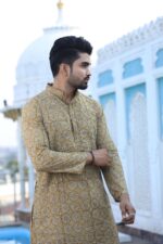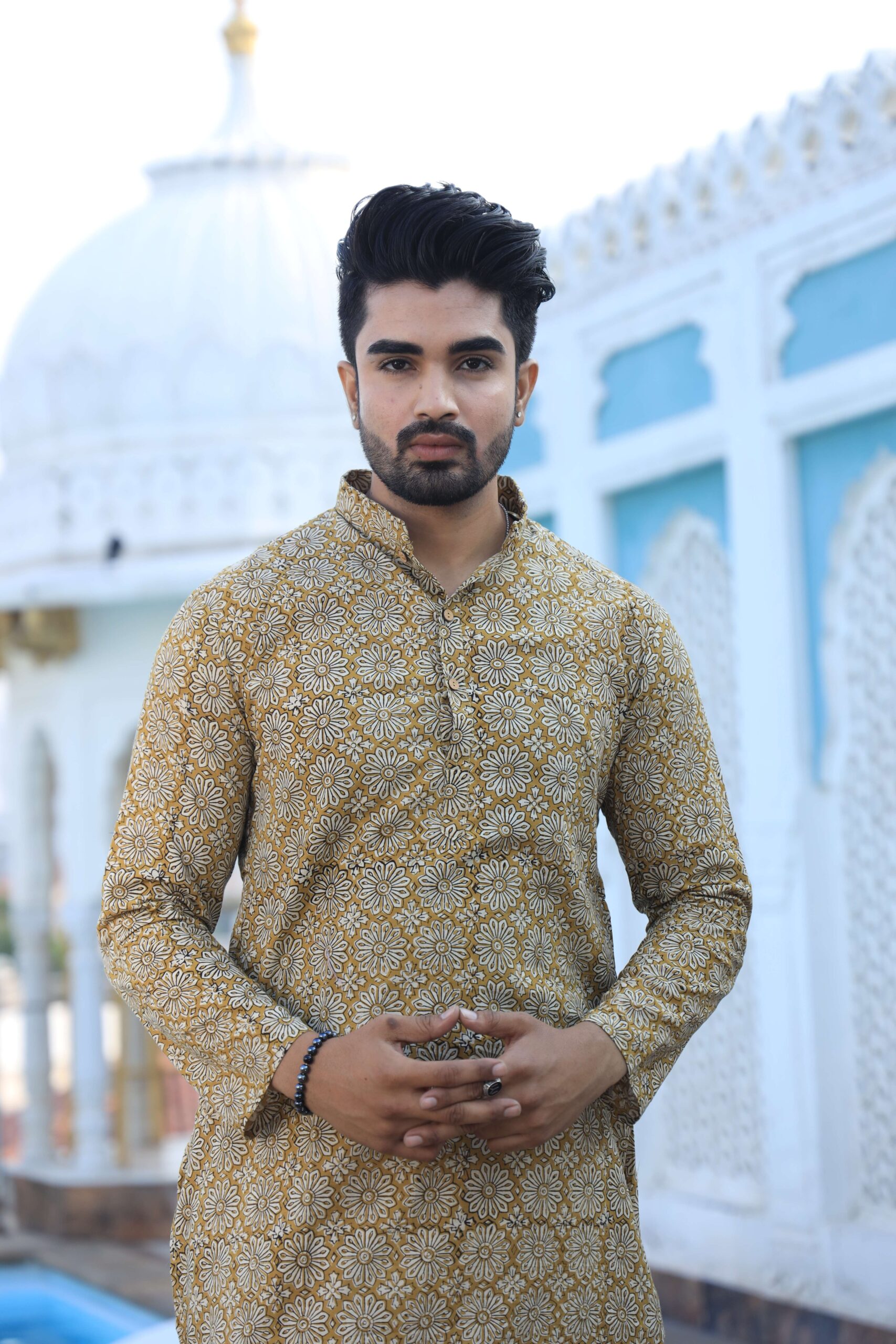 Upgrade your ethnic wardrobe with this men’s mustard yellow handblock printed cotton kurta pyjama set. Made from premium-quality cotton, it offers a relaxed fit and all-day comfort while keeping your look refined and festive-ready.
