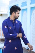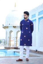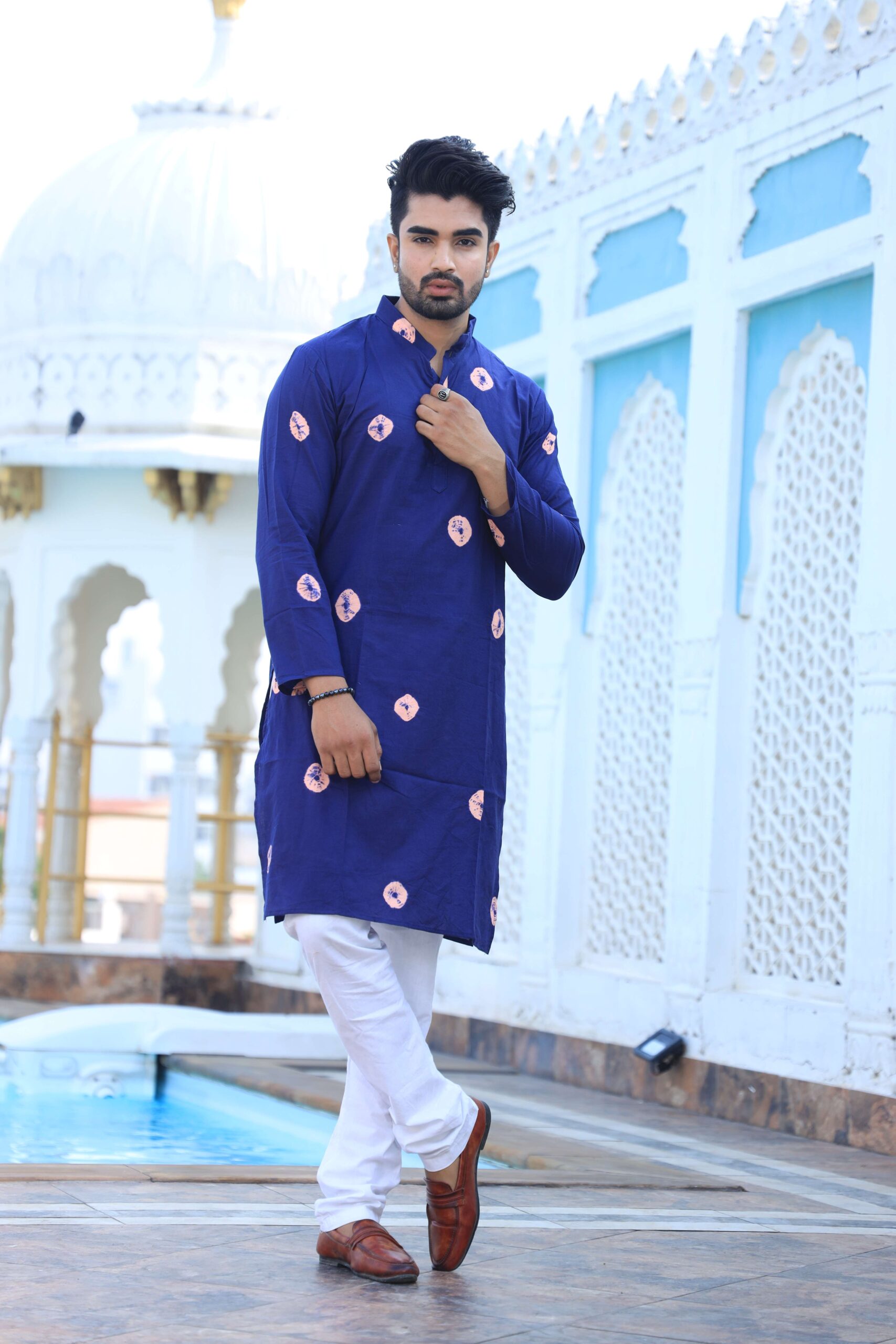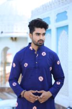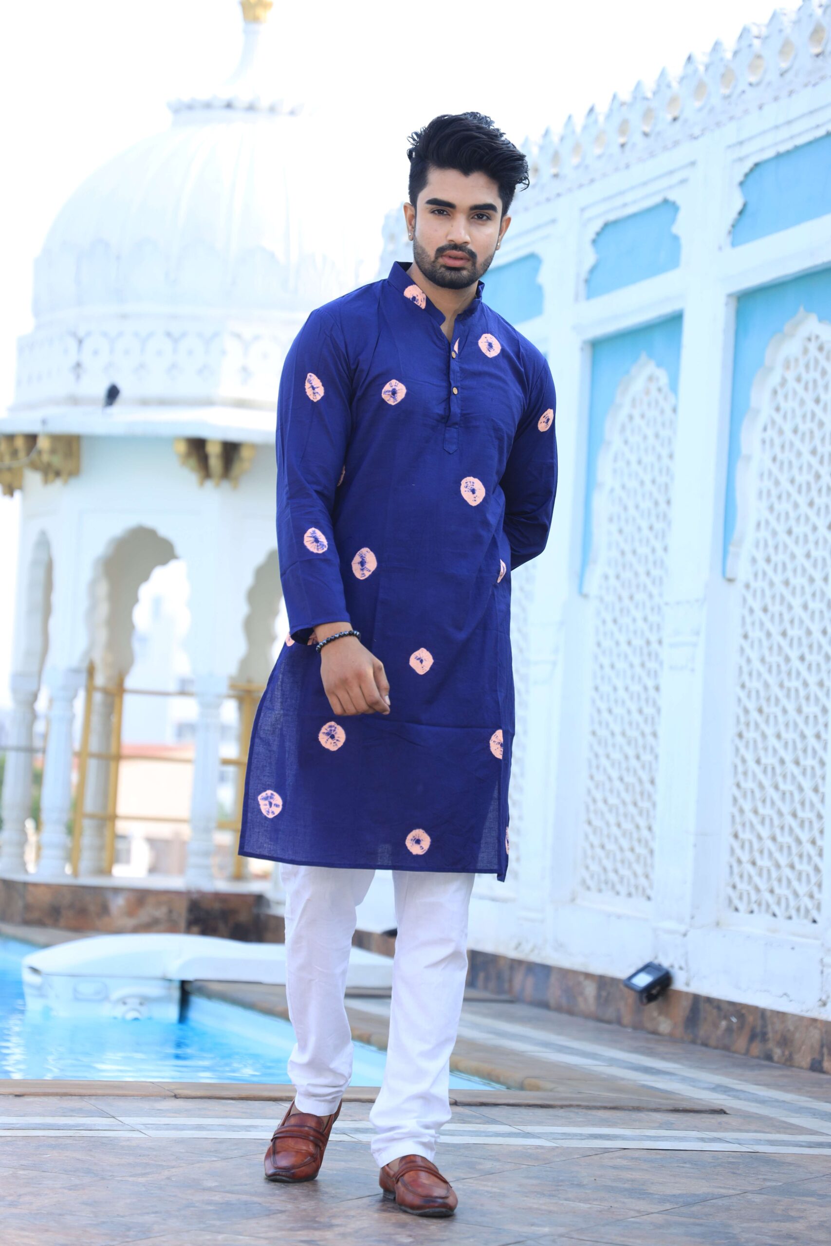 Upgrade your ethnic wardrobe with this men’s navy blue printed cotton kurta pyjama set. Made from premium-quality cotton, it offers a relaxed fit and all-day comfort while keeping your look refined and festive-ready.