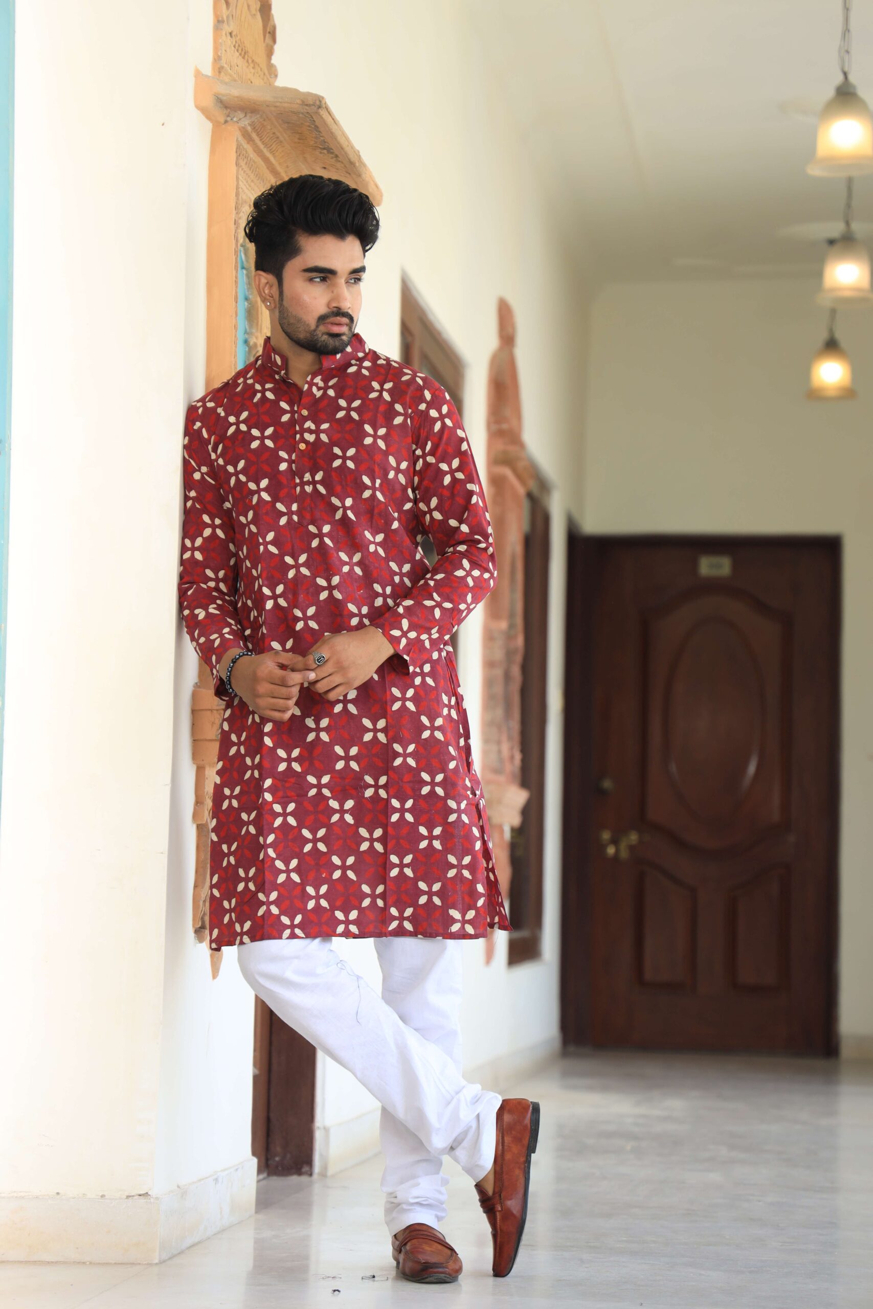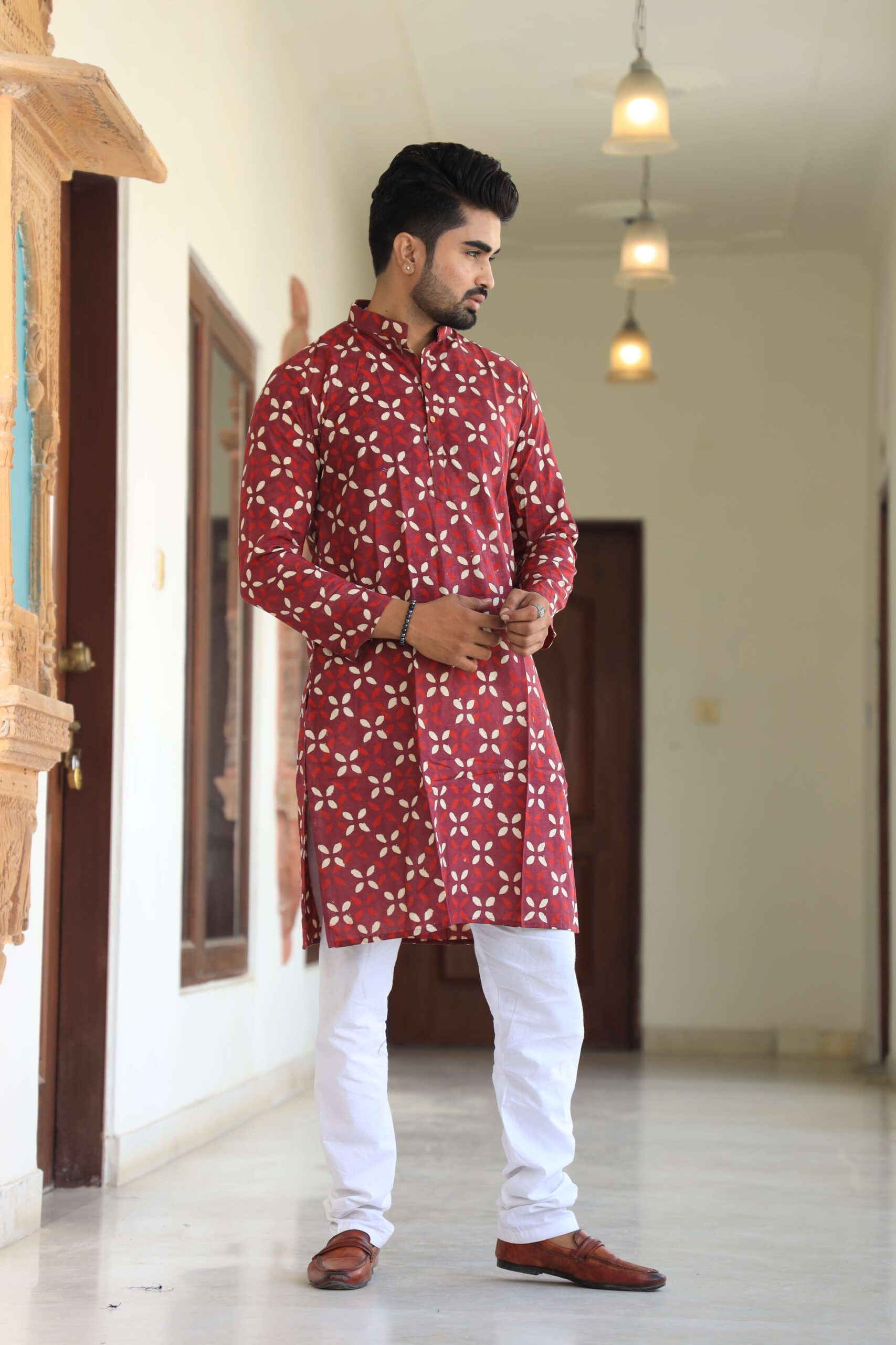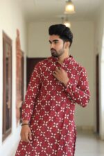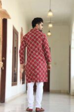 Men’s red floral printed cotton kurta pyjama set crafted in soft, breathable cotton for day-long comfort. Perfect for festive occasions, weddings, pujas and family gatherings, this stylish kurta with classic white pyjama keeps you looking sharp and feeling relaxed.