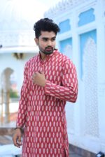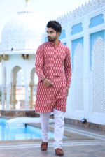Men’s red printed cotton kurta pyjama set crafted in soft, breathable cotton for day-long comfort. Perfect for festive occasions, weddings, pujas and family gatherings, this stylish kurta with classic white pyjama keeps you looking sharp and feeling relaxed.