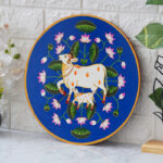 Awash in rich colors, this pichwai painting showcases a mother cow and her calf, surrounded by an abundance of blossoming flowers. This hand-painted artwork is a beautiful representation of nurturing love and the interconnectedness of life and nature.