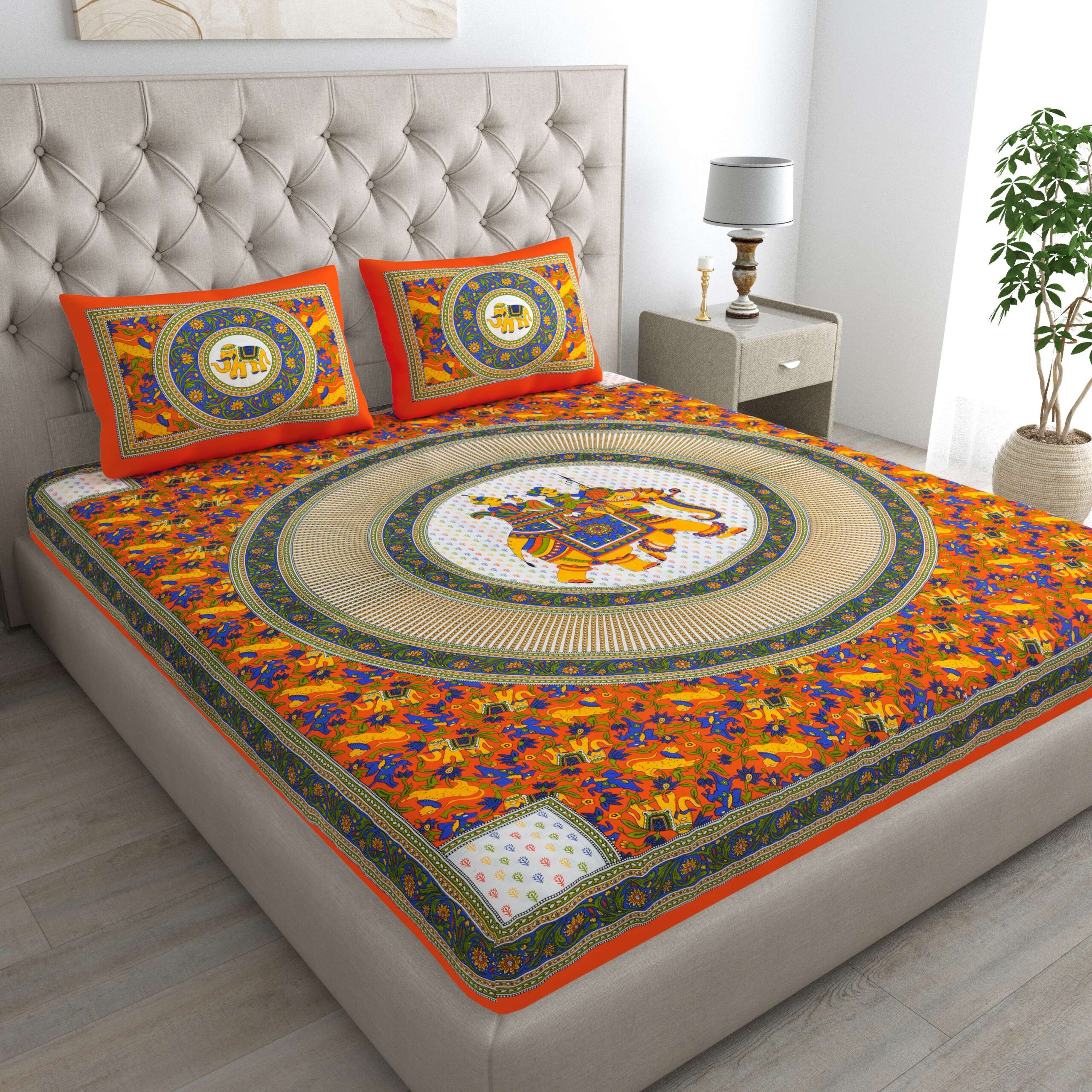 Enhance your bedroom d?cor with this Jaipuri Cotton Printed Double Bedsheet. Crafted from 100% pure cotton, it offers softness, breathability, and elegant traditional prints for a comfortable and stylish look. Comes with two matching pillow covers.
