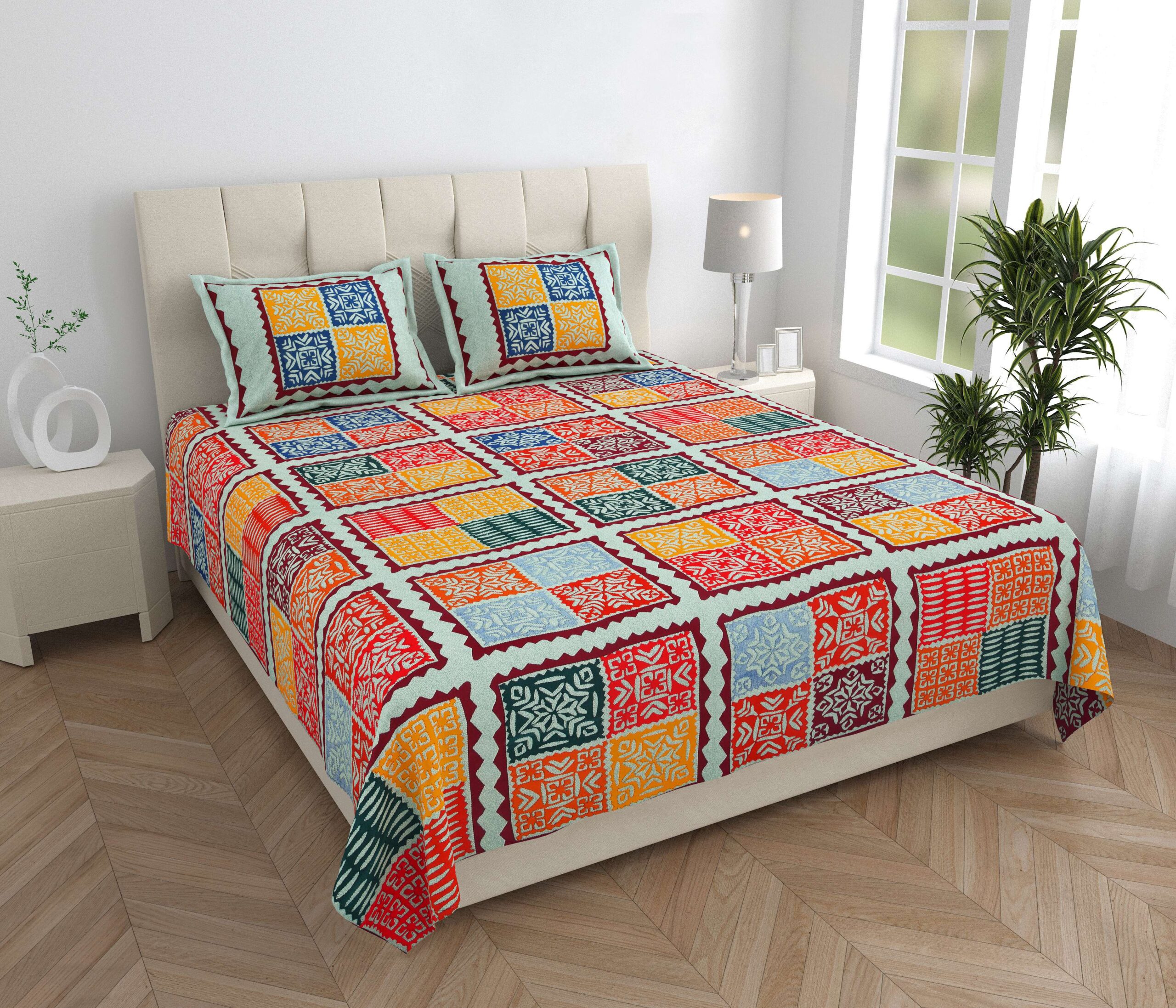Bring home this high?quality cotton double bedsheet beautifully crafted with handblock-inspired patterns. Its smooth texture provides premium-quality finish ideal for gifting, making it a perfect choice for comfort?focused living.