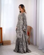 Women’s Chinon Silk Embroidery Sequence Work Straight Kurti With Sharara Suit and Dupatta Set