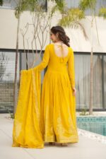 Completing the set is a matching dupatta decorated with sequin embroidery and a designer lace border, enhancing the festive richness of the look. Available in two captivating colours — Radiant Red and Bright Yellow — this Anarkali suit set is perfect for women who want sophistication with statement appeal.