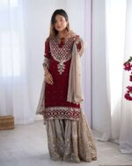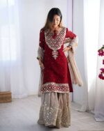 Women’s Chinon Silk Embroidery Sequence Work Straight Kurti With Sharara Suit and Dupatta Set