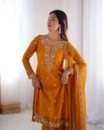 Women’s Chinon Silk with Cotton Thread Embroidery Straight Kurti With Pant and Dupatta set