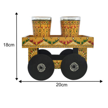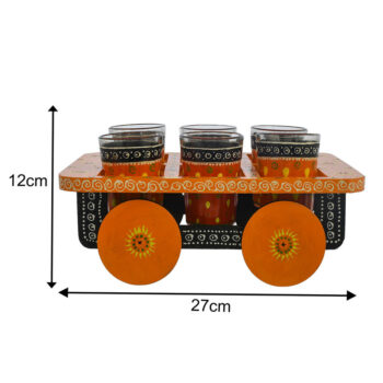 Mustard Yellow Hand-Painted Aluminium Tea Kettle Set with 6 Glass Tea Cups and Wooden Serving Cart | Artisan Tea Set