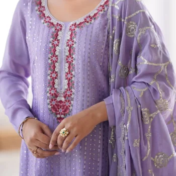 Women’s Chinon Silk Sequence And Thread Work Straight Kurti With Pant and Dupatta Set