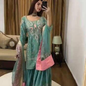 Original price was: ₹5,549.00.₹4,499.00Current price is: ₹4,499.00. Inc. All TaxesWomen’s Chinon Silk Heavy Embroidery Straight Kurta With Sharara and Dupatta set