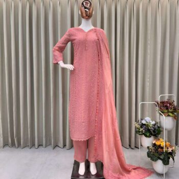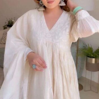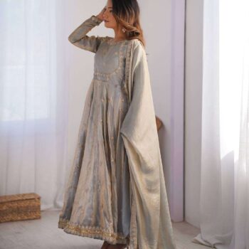 Original price was: ₹6,600.00.₹3,300.00Current price is: ₹3,300.00. Inc. All TaxesWomen’s Faux Blooming Anarkali Suit Set with Golden Zari & Sequin Embroidery + Embroidered Dupatta – Wedding & Festive Wear